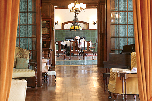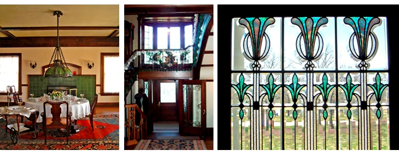 Unlike the classic exterior, the interior of the home is an example of the era's most up-to-date conveniences. Nine fireplaces of different design -most burning natural gas - augment the central heating. Gasoliers - using both electricity and natural gas - illuminate the home. Both the main doors have Tiffany leaded-glass panels featuring fleur-de-lis.