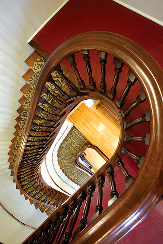 The French Renaissance (Second Empire) style is characterized by the distinctive shape of the roof. Standing 113-feet tall, you can see the courthouse and its red mansard roof from vantage points throughout the county on most days. Featured within this structure built of local limestone is a three-story spiral staircase made from walnut trees from the Cottonwood River.