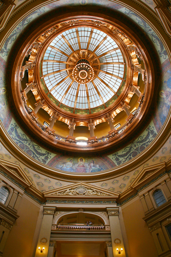Beautiful statues and famous murals (including ones by John Steuart Curry) and paintings add to the beauty of the interior. Also, the 1923 elevator is one of the few hand-operated passenger elevators still used in the state.