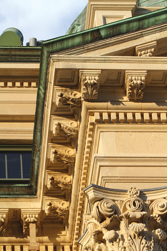 columns in the Senate Chamber are made of copper. They were hand hammered by Italian artisans using a technique known as repousse'. The design is hammered from the backside out into a mold and then the details are finished from the front. The design motif includes roses and morning glories (some of our native wildflowers). The ceiling is European Renaissance design and the round glass windows near the top of the Senate Chamber were imported from France.