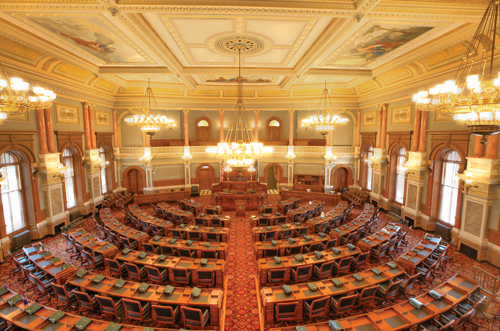 The ceiling in the chambers of the House of Representatives was designed in French-Italian Renaissance style. The murals on the ceiling that had been painted in 1882 were uncovered and restored in 1998. They were painted by E.S. Miragoli and Co. of St. Louis. The wainscoting is rose-gray marble from Tennessee and is trimmed with white Italian marble. Panels of brocelian marble, Belgian black marble, and jasper, a variety of quartz, are the inset panels in the wainscoting on the east and west walls. The names of prominent free state leaders and abolitionist are painted above the windows in the House Chamber. The columns in the House Chamber look like marble but are actually a scagliola -- faux marble technique that mixes paint with plaster to replicate the look of marble. They are then polished with carnuba wax to give it a shiny finish.