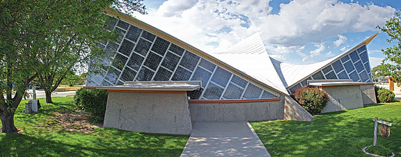 Built in 1963 by the George Pitcher & Company, this unique style consists of a surrounding canted concrete base, three hyperbolic paraboloid wood roof structures, and continuous stained-glass windows between. The light entering the church is kaleidoscopic.