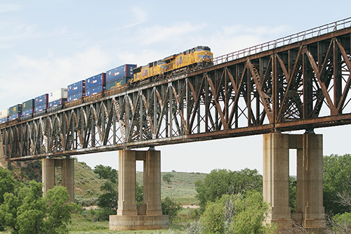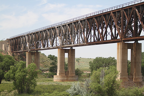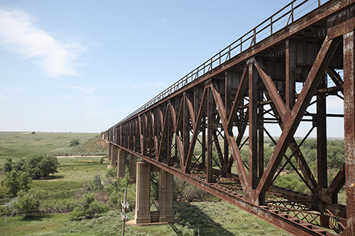 The Mighty Samson of the Cimarron was erected in 1939 to cross the Cimarron River. It was 1,268 feet long and considered an engineering marvel. It replaced 3.5 miles of curves and trestles and raised the railroad 113-feet above the river bed below, preventing the infrequent floods of the river from disturbing train traffic. Concrete pillars holding the giant structure were styled in the "art deco" design which was popular during this period.