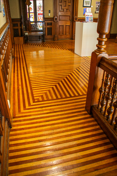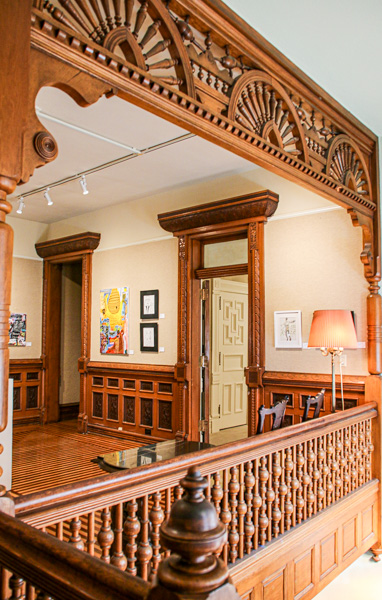 The Muchnic home was built in 1885. The 14-room, three story, brick residence was built by a lumber merchant, George W. Howell. For several years prior to construction, Mr. Howell, the builder, carefully collected beautiful woods to use in the interior. Especially noteworthy are the handsome parquet floored of walnut, mahogany and oak. The lower and upper halls, the dining room and library floors are of intricate design and beauty. All the woodwork is carved, and especially unique are the carvings of the faces on the ornate newel posts in the lower hall. The eight faces are said to represent the Howell family.