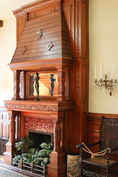 Cast bronze hardware is found on all the doors. Other notable details are the original fireplace tiles (each representing a theme), fireboxes, fenders and bronze fireplace trim. Embossed leather is found on the paneling in the dining room and both lower and upper halls. Beautifully etched glass embellishes the transoms above the bedroom doors on the second floor.