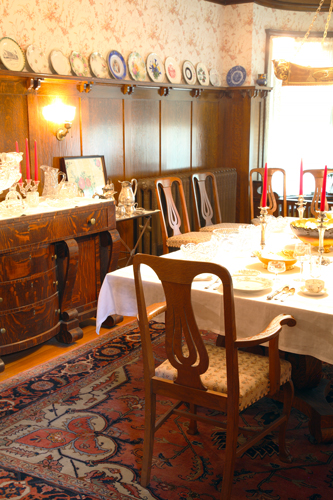 Grand Hall fireplace is by Tiffany of New York, a handpicked 1920 Steinway piano and a 1905 Edison Cylinder Phonograph grace the music room, while the dining room displays many pieces of glassware and other items used by Mrs. Seelye. After dinner the "men" would traverse down the curved oak stairs to the bowling alley, one of many items brought from the 1904 World's Fair. It is likely the oldest existing bowling alley in Kansas.
