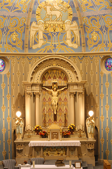 Construction of the present church, designed by architect Henry Brinkman of Emporia, began in 1912 under direction of Father S. F. Guillaume, with F. A. Rothenberger as head stone mason and Cidney Browne as head carpenter. Most of the labor was donated by parishioners. It was completed in stages at a cost of nearly $30,000, and the first mass was celebrated here in 1917. Improvements, including the beautiful stained-glass windows, interior decorating, and copper roof were added in later years.
