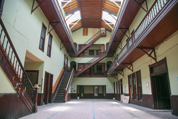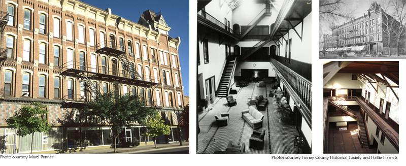 This 1887 innovation has served as a model for hotel design throughout the country. This four-story 55,000 square foot building opened with 125 hotel rooms, a large dining room, and 200 foot worth of space on the ground floor for businesses. The atrium was located on the second floor and extended upward for three stories and was topped by a vaulted skylight.