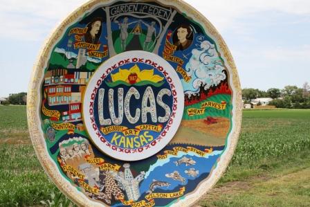 The dish itself is 14' in diameter, formed from a large fiberglass satellite dish with another, smaller dish mounted inside as the center medallion. Lots of local help went into realizing the project, with the City of Lucas crew providing labor, cement, and engineering expertise and the local telephone company providing one of their decommissioned communications dishes. Funded by a grant from the National Endowment for the Arts, the large travel plate was painted during September, October, and a little bit of November 2006 on-site, alongside state highway K-18.