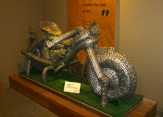Tour Guide at Grassroots Art Center, 213 S. Main Visionary artist Mri-Pilar has turned seven rooms of this house into an interior environment. The walls and ceilings are wrapped in silver insulation, and every inch is filled with Pilar's 3D sculptures of recycled materials. Pilar favors computer mother boards, household items, children's toys, car parts and Barbie dolls. See on-line blogs of her ReBarbs and digital dolls. This environment of recycled "stuff" is one of the most jaw-dropping places in Kansas.