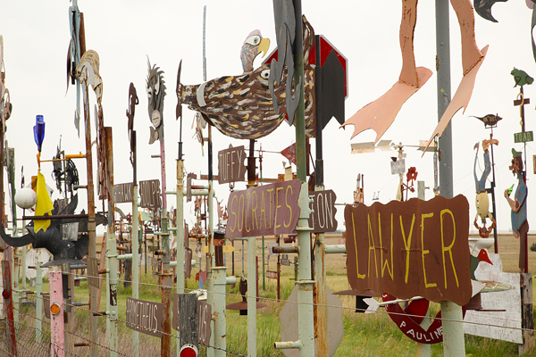Castoffs and pieces of unfinished projects are everywhere - an iron cut-out of a strange bird with big feet, a disembodied arm cut from metal, a cylinder bar from a combine, a center-rim truck tire, more junked road signs, a shank from a fertilizer applicator, tilling discs, rotary hoe wheels - fits and starts of Liggett's metallic lampoons and cartoons, which he calls "totems."