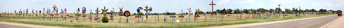Liggett, 73 (in 2004), traveled the world during his military career, but never really strayed far from Mullinville. "I've had the same mailing address for 73 years. I was born in a claim shack on that hill," he says, gesturing towards the pasture where his crazy mishmash of satirical artwork spins and bobs in the prairie wind.