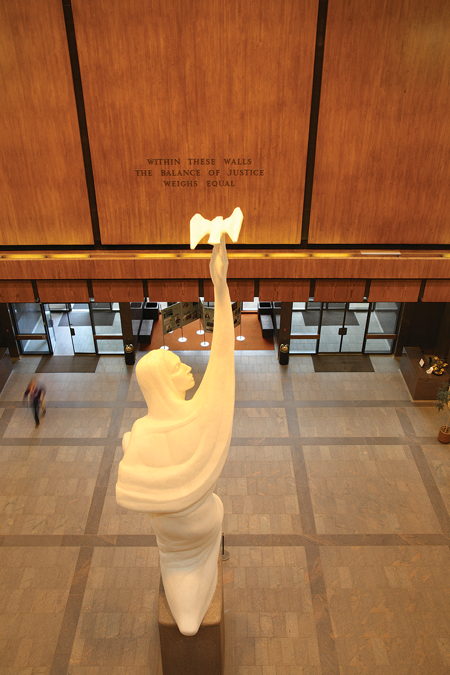 A new symbol of "Justice", conceived and designed by Bernard "Poco" Frazier (Athol, KS native), kneels on an eight-foot high granite pedestal at the center of the Kansas Judicial Center. Departing from the traditional upright figure of a woman, blindfolded with sword and scales, the new symbol emerges in a more gentle kneeling posture of a woman, eyes open, looking at her upraised arm, upon which is perched the symbolic figure of the Prairie Falcon, native to Kansas. A perceptive "Justice" departs from the "Justice is Blind" traditional symbol, expressed through the "Prairie Falcon" whose vision is thought by scientists to be eight times as powerful as that of man. Being one of the swiftest birds known, the Falcon equally symbolizes "speedy justice".