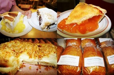 From left to right top: Lemon Meringue Pie, Chocolate Cream Pie and Peach Pie From left to right bottom: Bienen Stich (Bee Sting Coffee Cake), Homemade bread