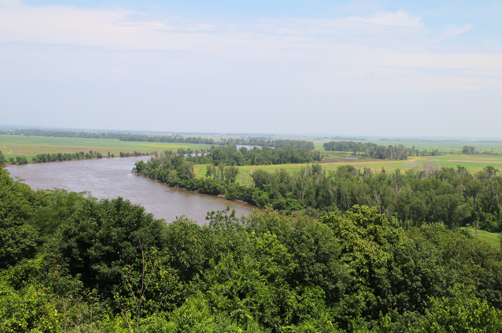 Nebraska is just three miles north of the lookout with Iowa about 60 miles north. Missouri is to the south. Sections of farmland are as much a part of the view as the river.