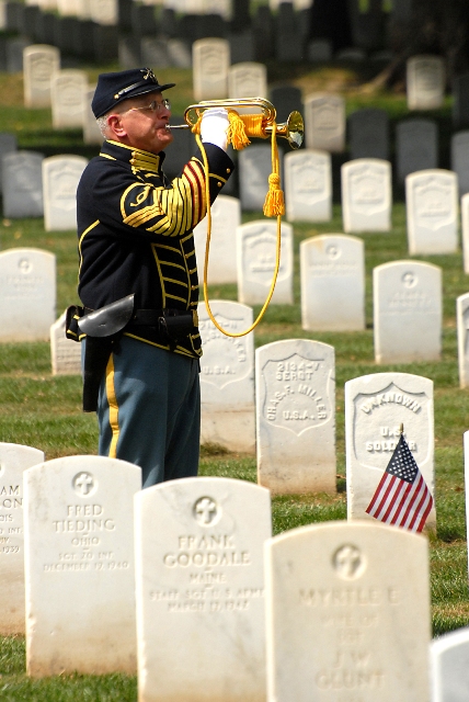 Retired Col. Sam Young plays "Taps" during the Fort Larned deceased soldier memorial dedication ceremony Sept. 19, 2009, at the Fort Leavenworth National Cemetery at Fort Leavenworth, Kan. The memorial lists the names of soldiers who died at Fort Larned from 1859-1878 and whose remains may have been re-interred in "Unknown U.S. Soldier" graves at Fort Leavenworth National Cemetery in 1888. Photo courtesy Prudence Siebert/Fort Leavenworth Lamp.