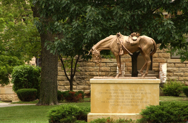 CIVIL WAR HORSE STATUE facing the street in front of the U.S. Cavalry Museum. Placed on the museum grounds in 1997, this statue is dedicated to the million and a half horses and mules that perished or were used during the Civil War.This three-quarter size statue of a riderless horse ravaged by the war was commissioned by Paul Mellon who served at Fort Riley during World War II.