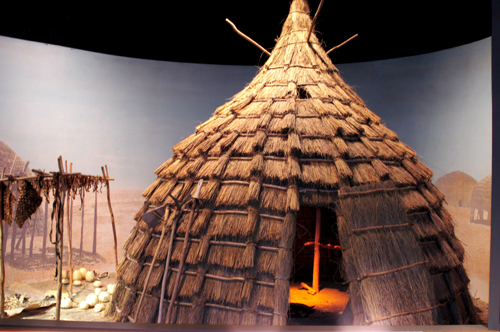 A full-sized Southern Cheyenne tipi and Wichita grass lodge accompany exhibits on