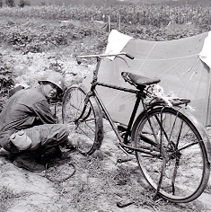 Father Kapaun repairing his bicycle during the war. Photo courtesy Father Kapaun Guild