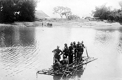 Rafts crossing the Rio Grande River in the Philippines. Col. Frederick Funston is standing at the right on the raft. Photo courtesy Kansas Historical Society