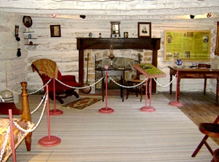 Adair Cabin, located at the John Brown Museum State Historic Site. Exterior photo courtesy Travis Perry; Interior photo courtesy Dr. Doug McGovern.