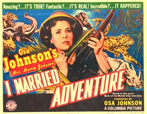 | Lobby poster for Osa Johnson's 1940 Columbia Pictures film I MARRIED ADVENTURE. Photo courtesy the Martin and Osa Johnson Safari Museum, www.SafariMuseum.com. |