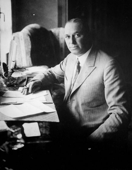 Walter Percy Chrysler seated at a desk in his home in
