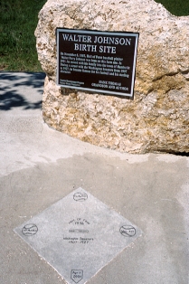Walter Johnson's birthplace monument. Take U.S. 169 to exit road 224. Go 1mile west to dead-end at 1100 Road, also marked Old Highway 169. Turn right. Go north 2 miles to a hanging sign at Iowa Road and 1100 Road. Turn left at Iowa. Go west 2 miles to the intersection of Iowa and 900 Road. You will see Walter Johnson's monument and plaque on the northwest corner of a field on his birthplace farm.
